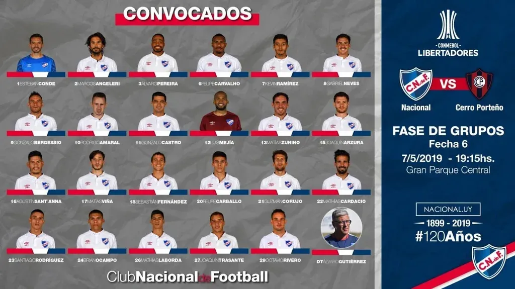 El entrenador de Nacional, Álvaro Gutiérrez, dio la nómina de convocados para el partido de los tricolores ante Cerro Porteño de este martes a las 19:15 en el Parque Central, por la última etapa del Grupo E de la Copa Libertadores.