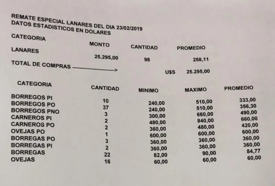 El precio máximo fue para la cordera PO Gran Campeona del Prado que se vendió por US$ 600. El máximo de los carneros PI fue de US$ 840.