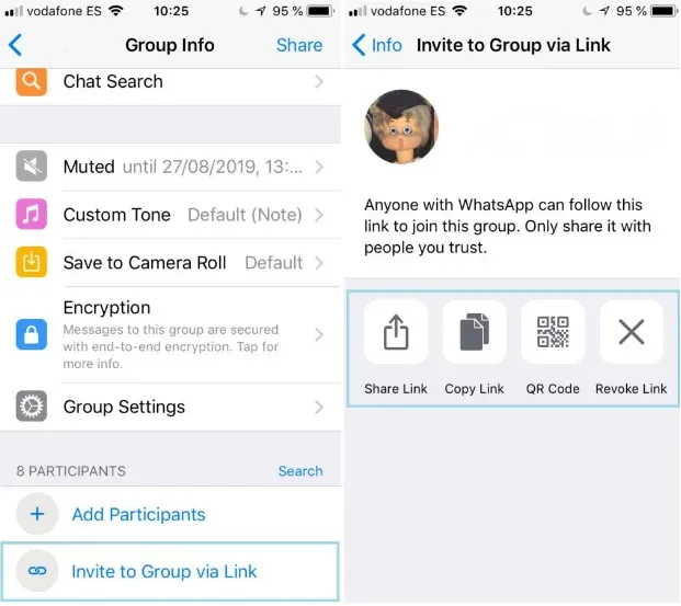 Otra opción es añadir personas que no estén en la agenda de contactos del teléfono. Para hacerlo el administrador puede añadir usuarios a través de un enlace. Debe hacer click en el nombre y buscar la opción que dice “invitar vía enlace”.