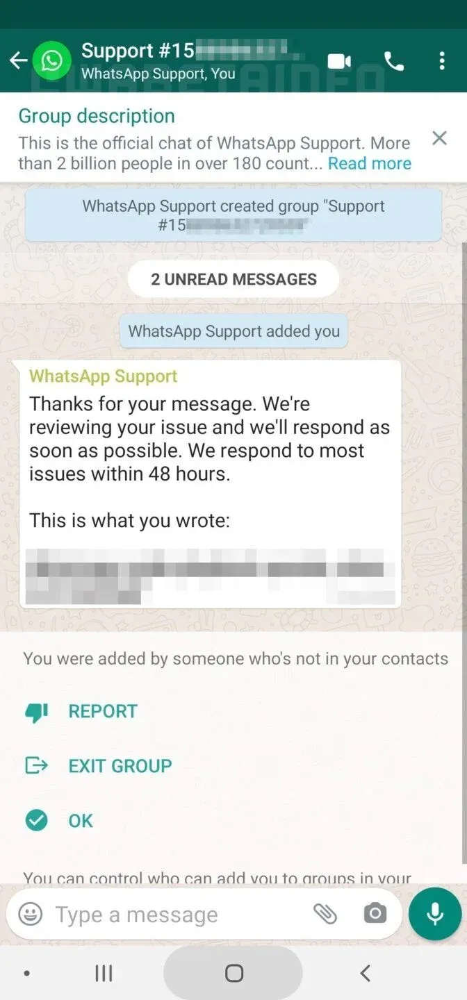 WABetaInfo Captura del chat que se abrirá automáticamente para dar soporte al usuario. Cuando el soporte técnico de la red de mensajería considere resuelto el problema, abandonará el grupo. Como es habitual luego de la polémica por la privacidad, la conversación entre el usuario y WhatsApp estará protegido por cifrado de extremo a extremo.