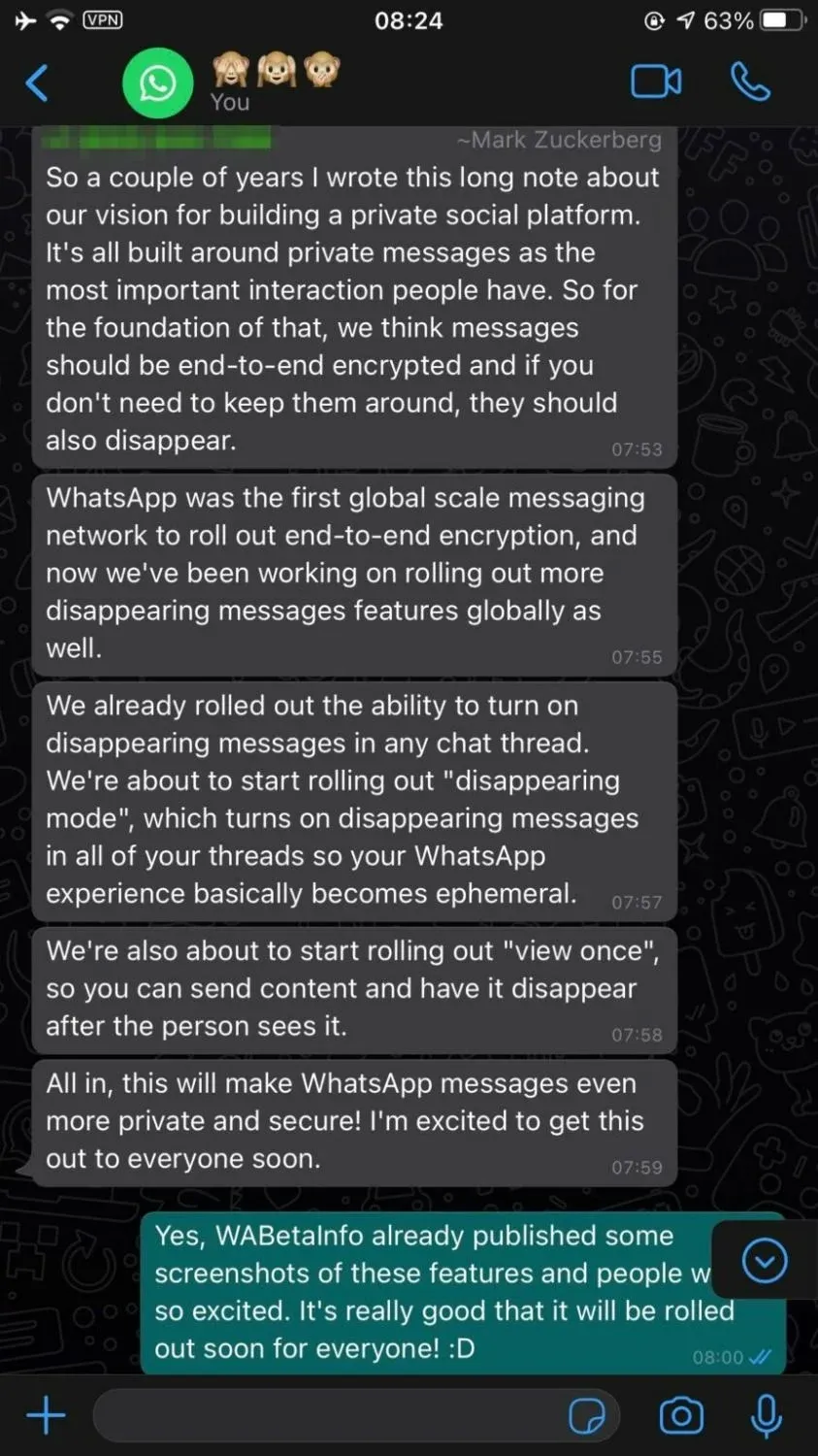 Captura de pantalla de la conversación que mantuvo WABetainfo con Zuckerberg vía WhatsApp.
