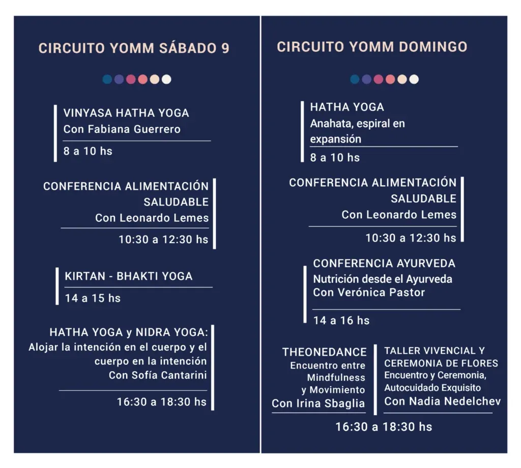 El Circuito YOMM para el domingo 10 consta de una práctica de yoga, una conferencia sobre alimentación saludable, una conferencia sobre alimentación Ayurveda y, a elegir, una práctica de meditación en movimiento o una ceremonia de flores.