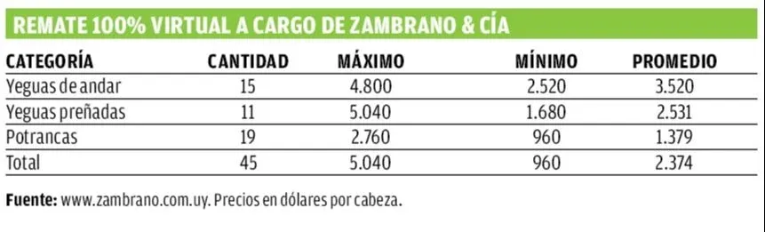 La subasta estuvo a cargo del equipo de Zambrano & Cía, con una oferta de Criollos de pedigrí colocados en 24 cuotas en dólares sin intereses.