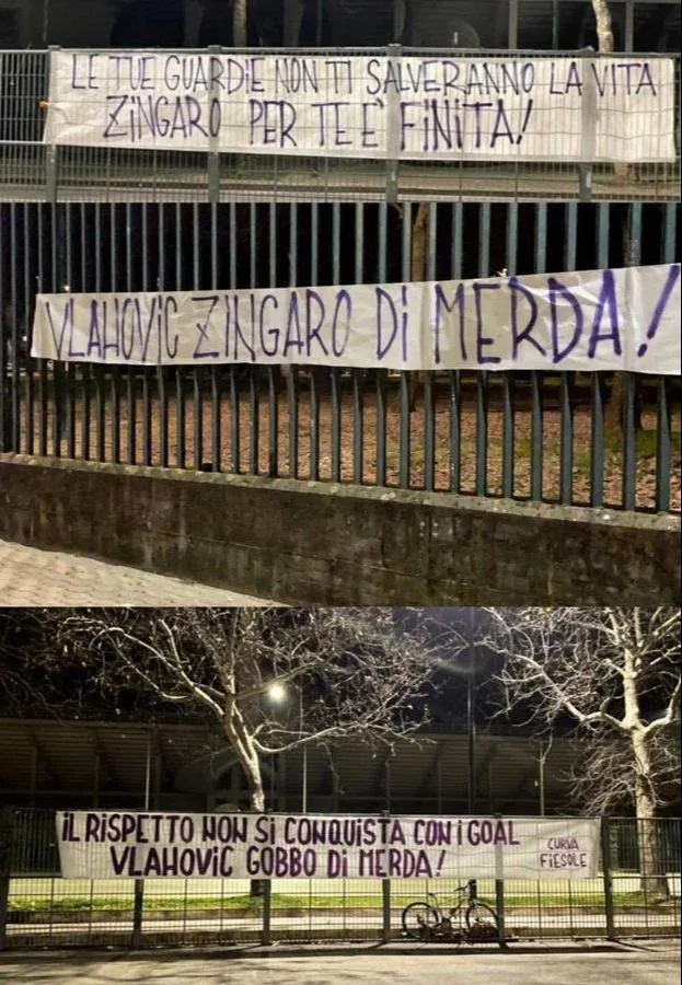 "Tus guardias no te salvarán la vida. Zíngaro, estás acabado", escribió la barra de Fiorentina en una pancarta que se colgó en el estadio Artemio Franchi de Firenze donde la Fiore recibirá este miércoles a Juventus en semifinales de la Coppa Italia.