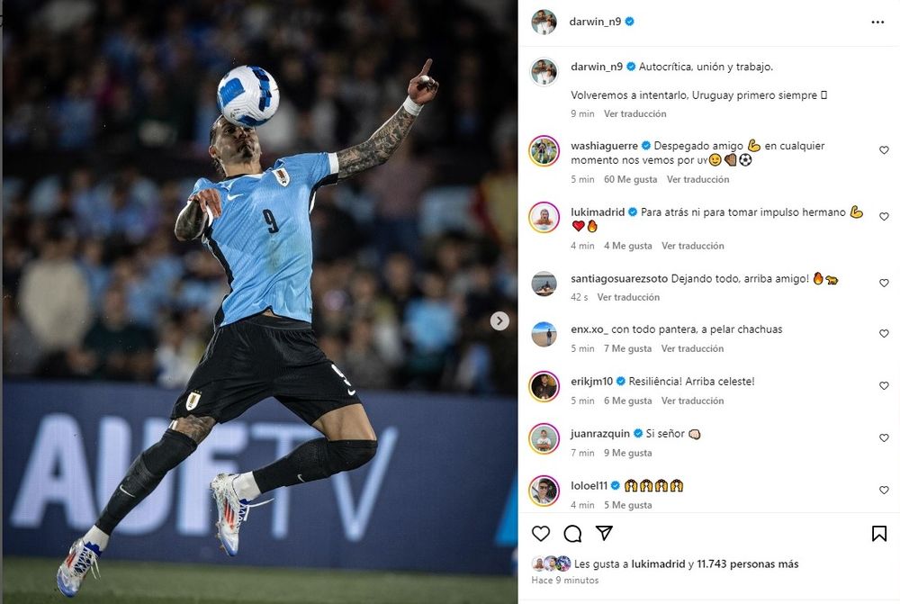 Darwin Núñez, que volvió a jugar en la selección de Uruguay en las últimas dos fechas de Eliminatorias, tras la habilitación del TAS (cumplió dos de las cinco fechas de sanción tras la Copa América), dejó un mensaje en las redes sociales luego del empate contra Ecuador, este martes en el Estadio Centenario.
