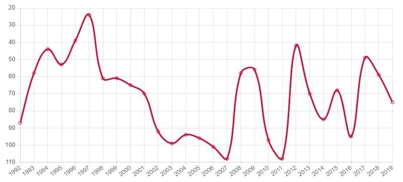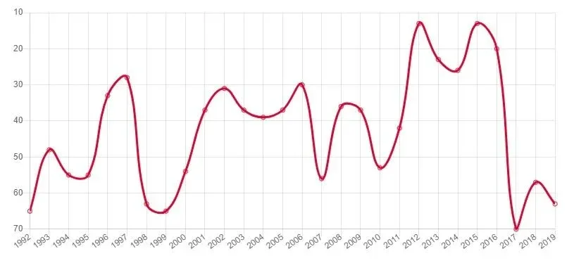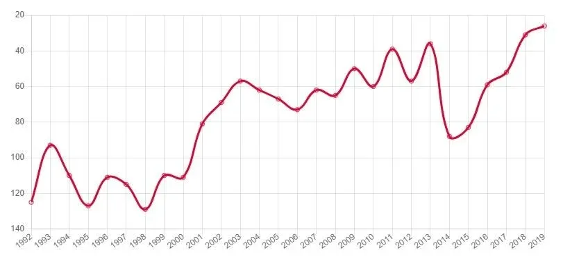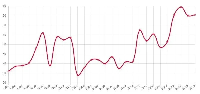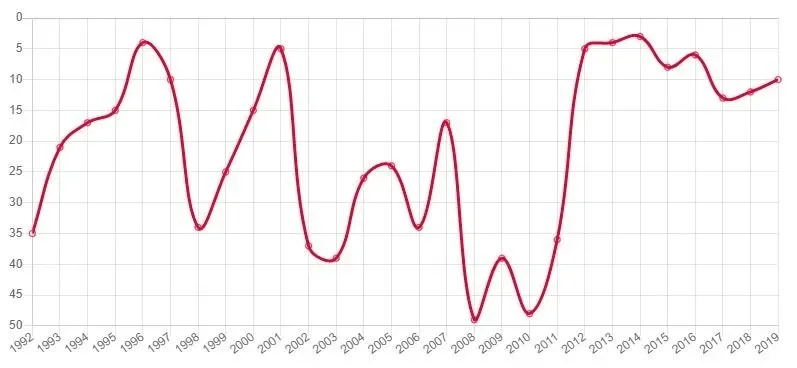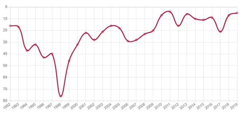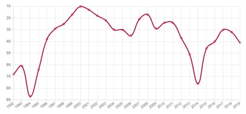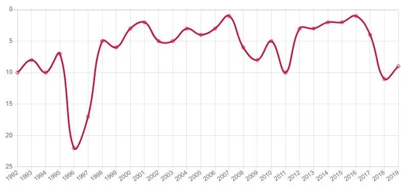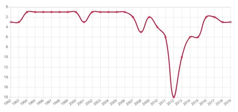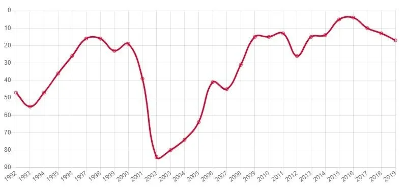 De la estadística se desprende que desde 1992 y hasta 2007 se mantuvo en el top 3. Desde ese momento cayó en una profunda depresión en el gráfico, del que salió en el año del Mundial de 2014.